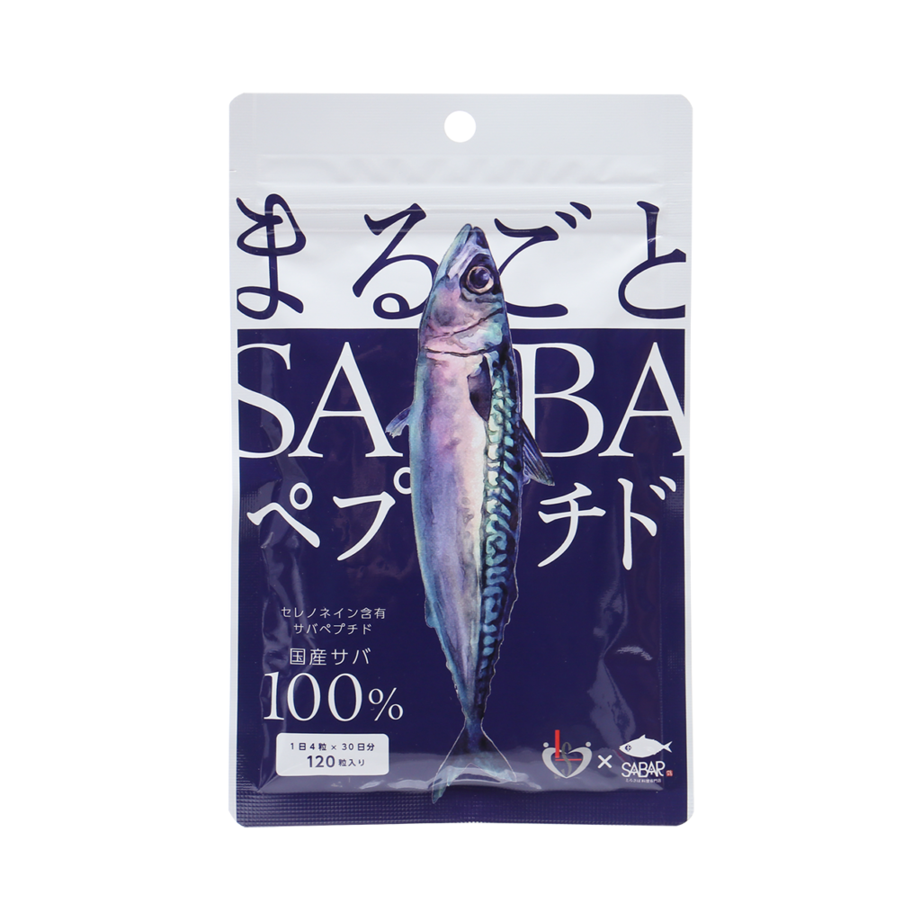 まるごとSABAペプチドはセレノネインを規格したサバペプチド原料を4粒中に1,000㎎配合した日本初(※1)のサプリメントです。国産サバをまるごと(※2)酵素処理して粉末にしたサバペプチドとセレノネインを摂取し易い錠剤にしました。セレノネインは国立研究開発法人水産研究・教育機構が研究する注目のエイジングケア成分です。本品は、サバ専門商社の株式会社鯖や(SABAR)とのコラボレーション商品です。また「セレン含有組成物の製造方法およびその組成物」の特許(第6733899号)、「セレン化合物含有組成物」の特許(第7598656号)も取得しました。